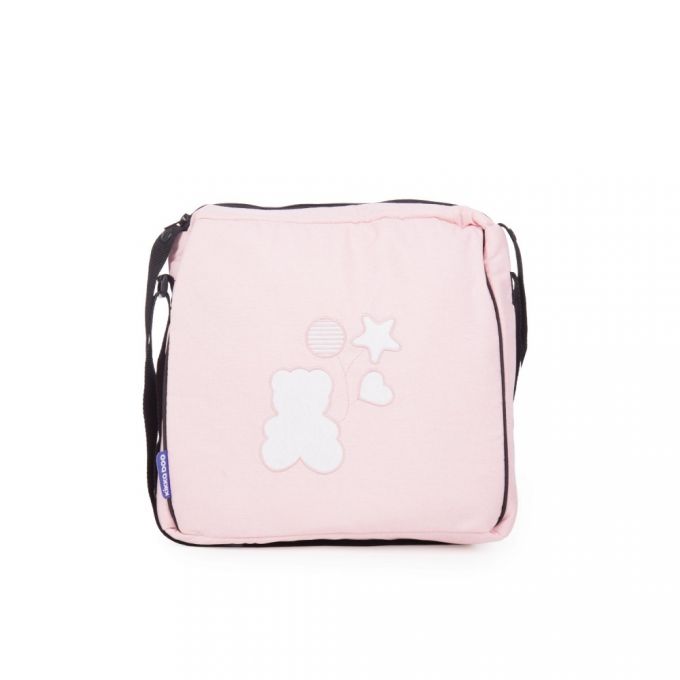Sistema de arnés de 5 puntos con hombreras y protector en la hebilla inferior.
