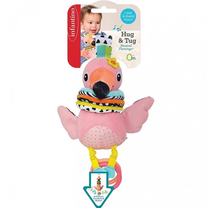 Este gracioso y atrayente flamenco musical toca una dulce canción de cuna cuando tiras de la anilla.