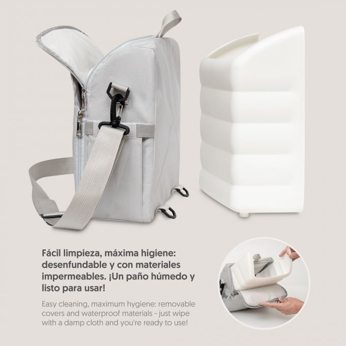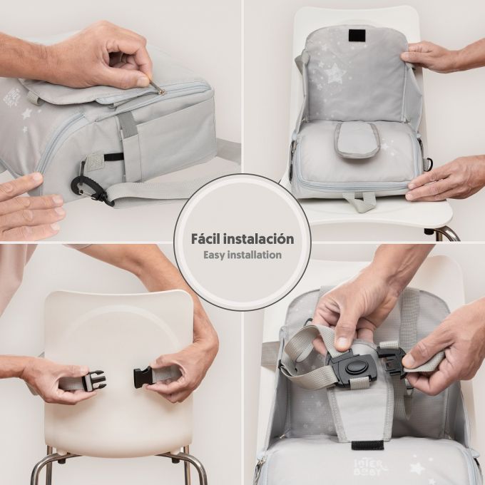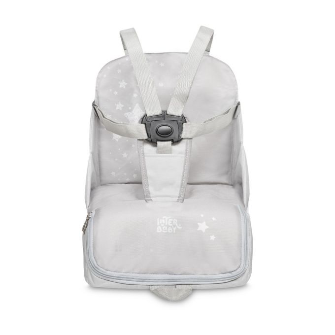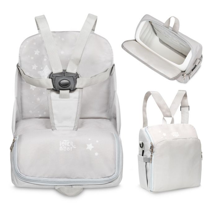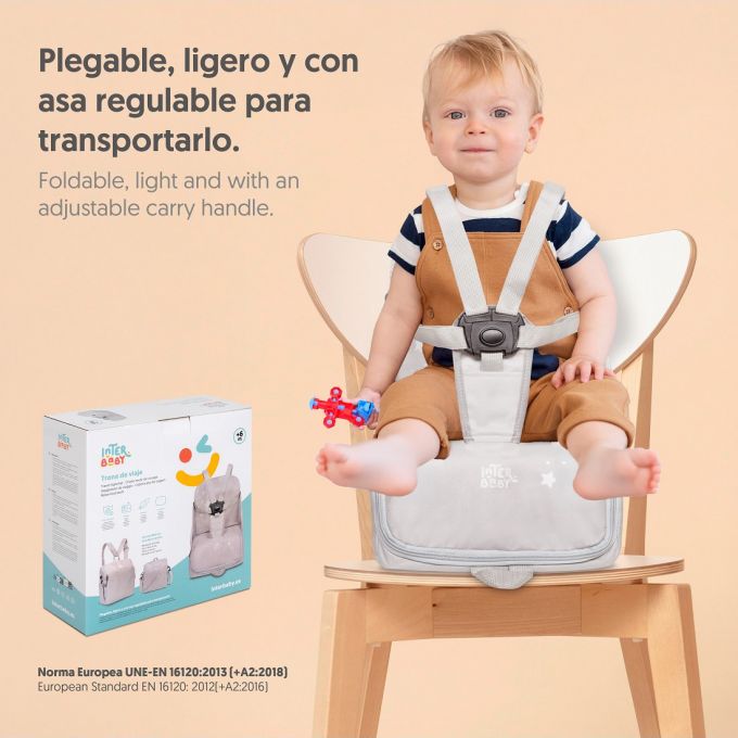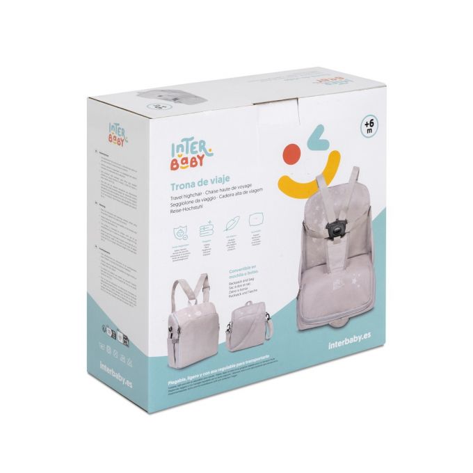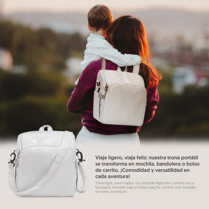 Trona de Viaje. Covertible en mochila o bolso. Plegable , ligera y con asa reguladora para transportarla. Arnés de seguridad de 5 puntos ajustables. Correas ajustables para acoplar a la silla. Compartimento de gran capacidad. Bolsillos interiores y laterales. Totalmente desenfundable. Recomendado de 6 a 36 meses o un máximo de 15 kg. de peso.