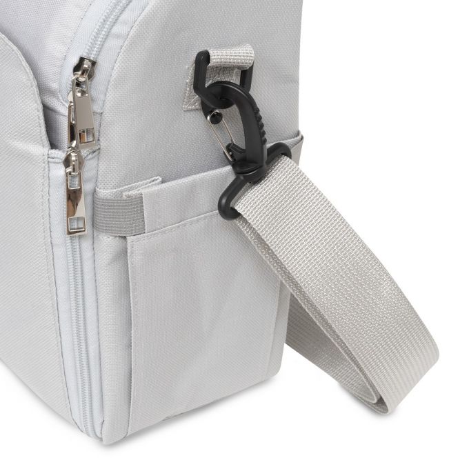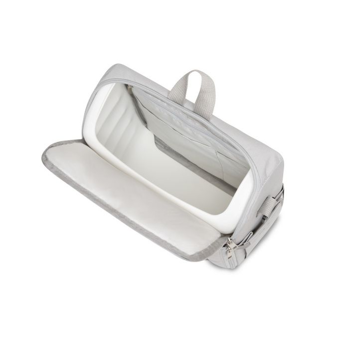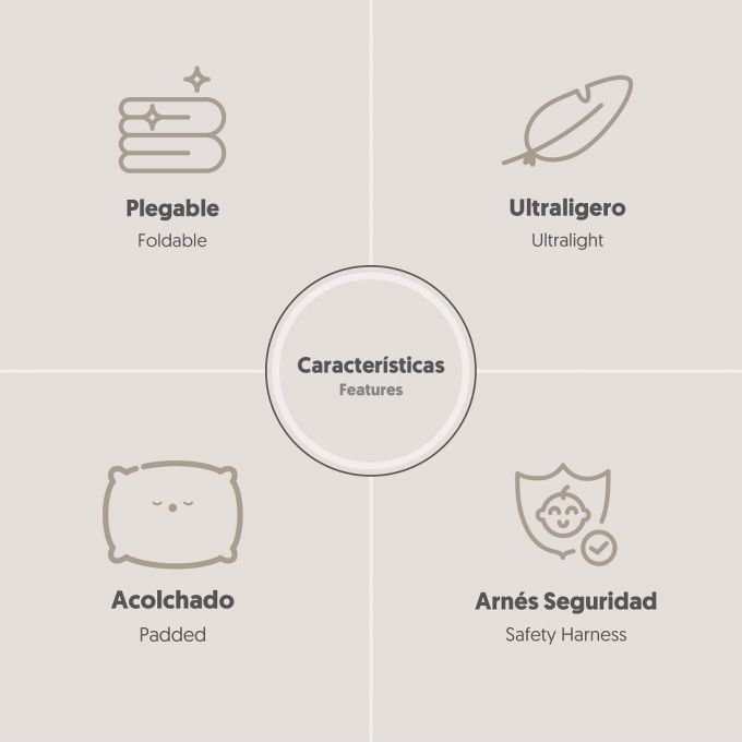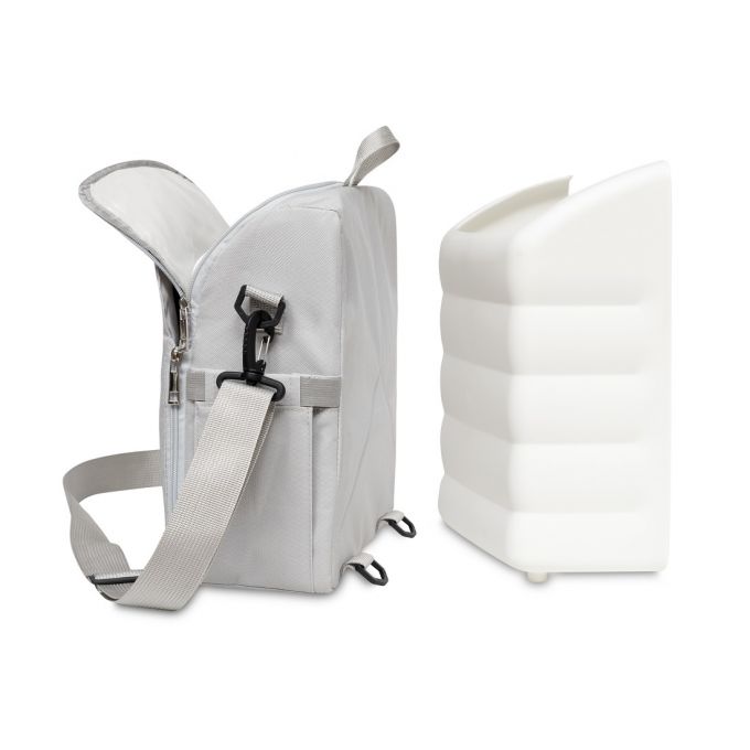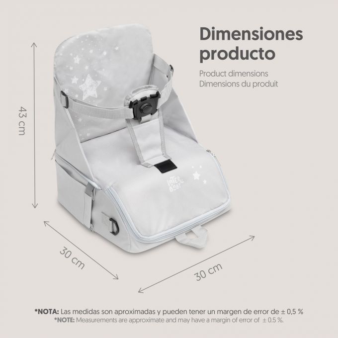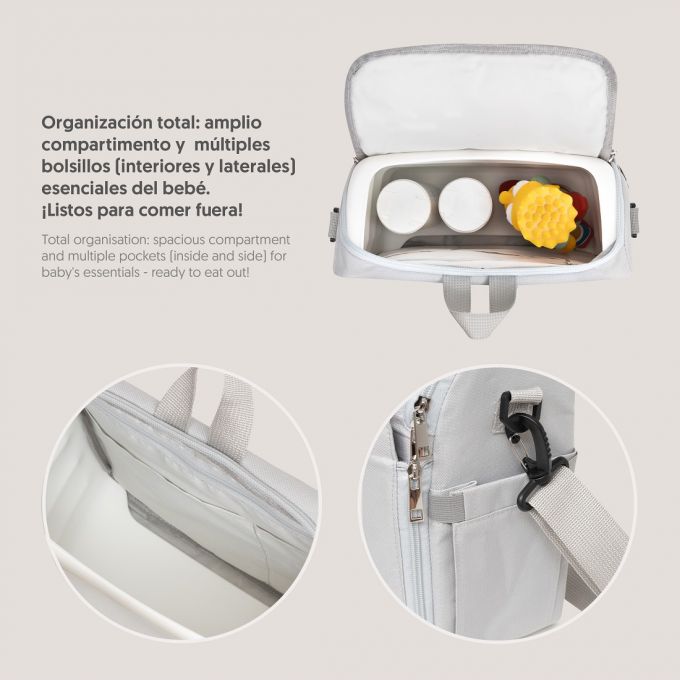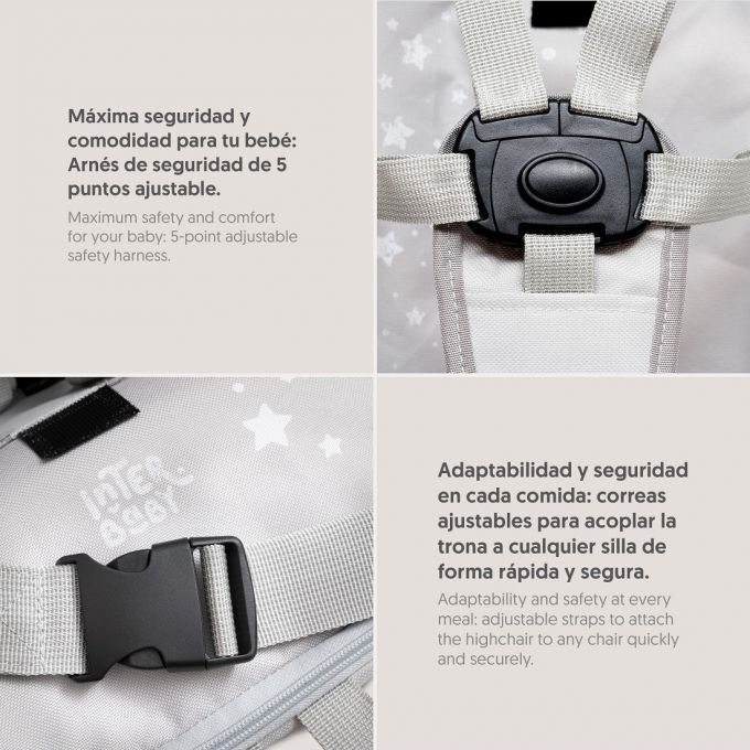 Trona de Viaje. Covertible en mochila o bolso. Plegable , ligera y con asa reguladora para transportarla. Arnés de seguridad de 5 puntos ajustables. Correas ajustables para acoplar a la silla. Compartimento de gran capacidad. Bolsillos interiores y laterales. Totalmente desenfundable. Recomendado de 6 a 36 meses o un máximo de 15 kg. de peso.