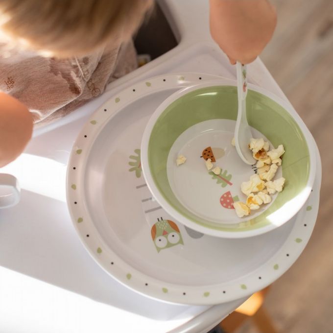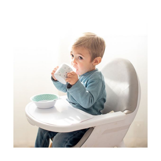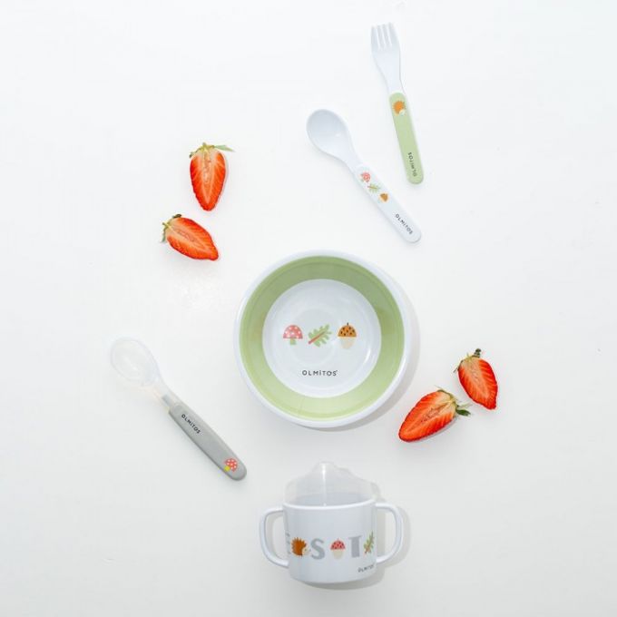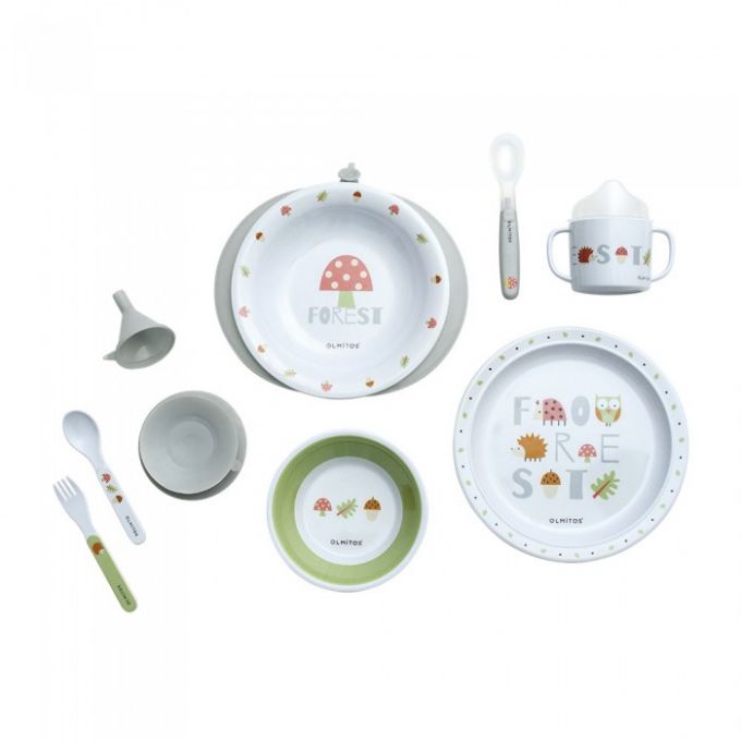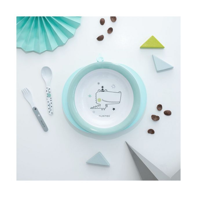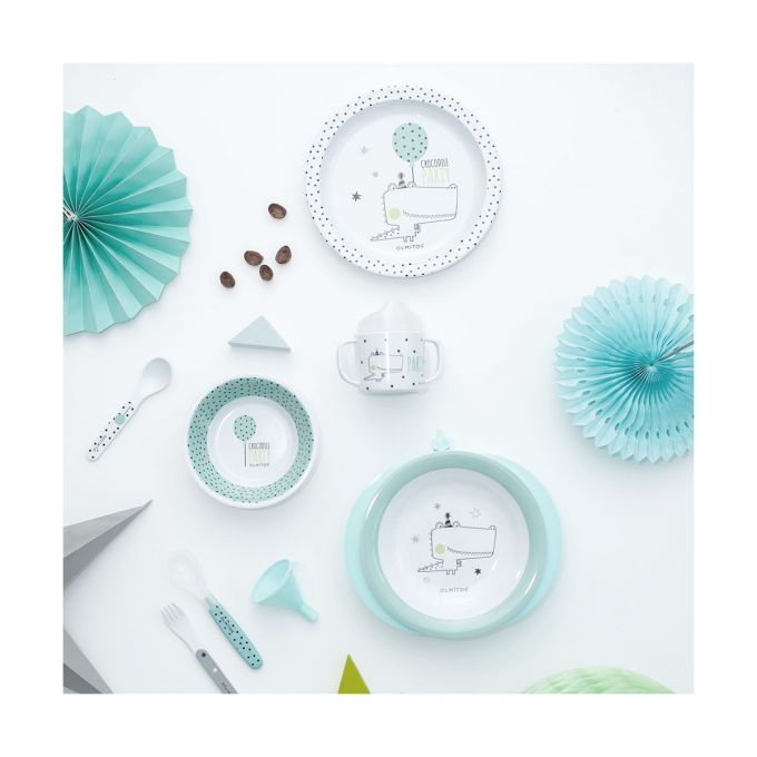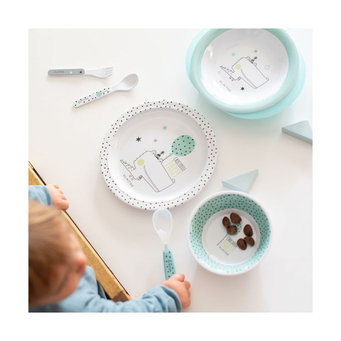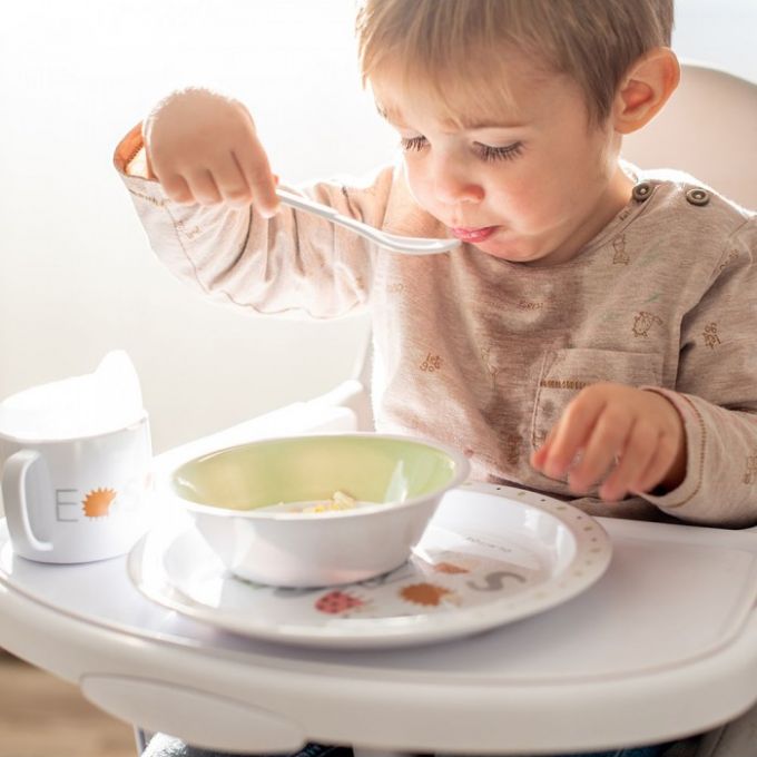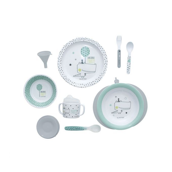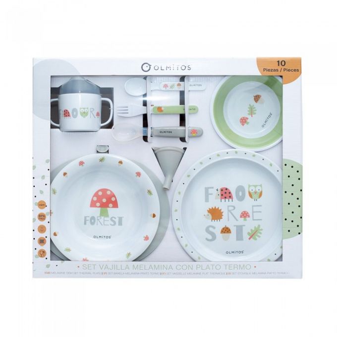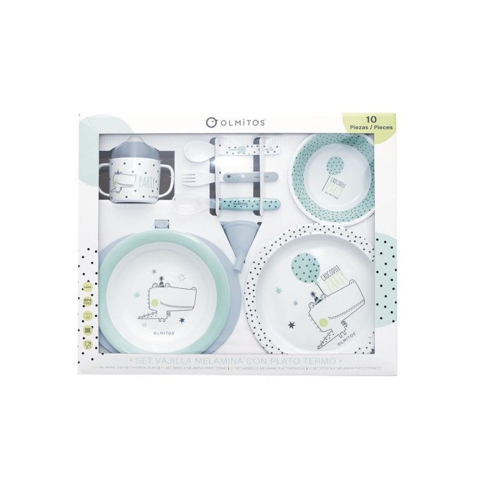 Nuestra vajilla de 10 piezas está especialmente diseñada para los niños. Contiene: Bol, plato llano, plato termo, cuchara silicona, cuchara, tenedor, taza, tapa con boquilla, embudo y ventosa para fijar los platos a la mesa.